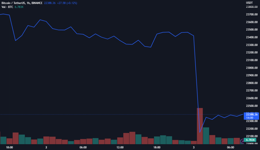 Portalkripto.com — Harga Bitcoin (BTC) dan seluruh aset kripto major coin lainnya, termasuk Ether (ETH), mengalami penurunan tajam pada 3 Maret 2023. Harga BTC turun 5% ke kisaran harga terkini di angka $22.300 per keping.