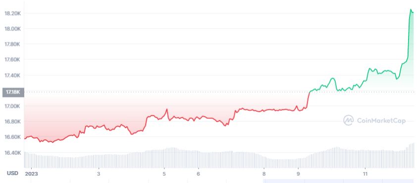 Berdasarkan data CoinMarketCap, harga BTC telah naik sekitar 10,7% sejak 1 Januari 2023 hingga memasuki penghabisan pekan kedua. Kenaikan harga BTC tercatat dari $16,547.91 saat pembukaan pasar di awal tahun ke $18,230.64 saat ini.