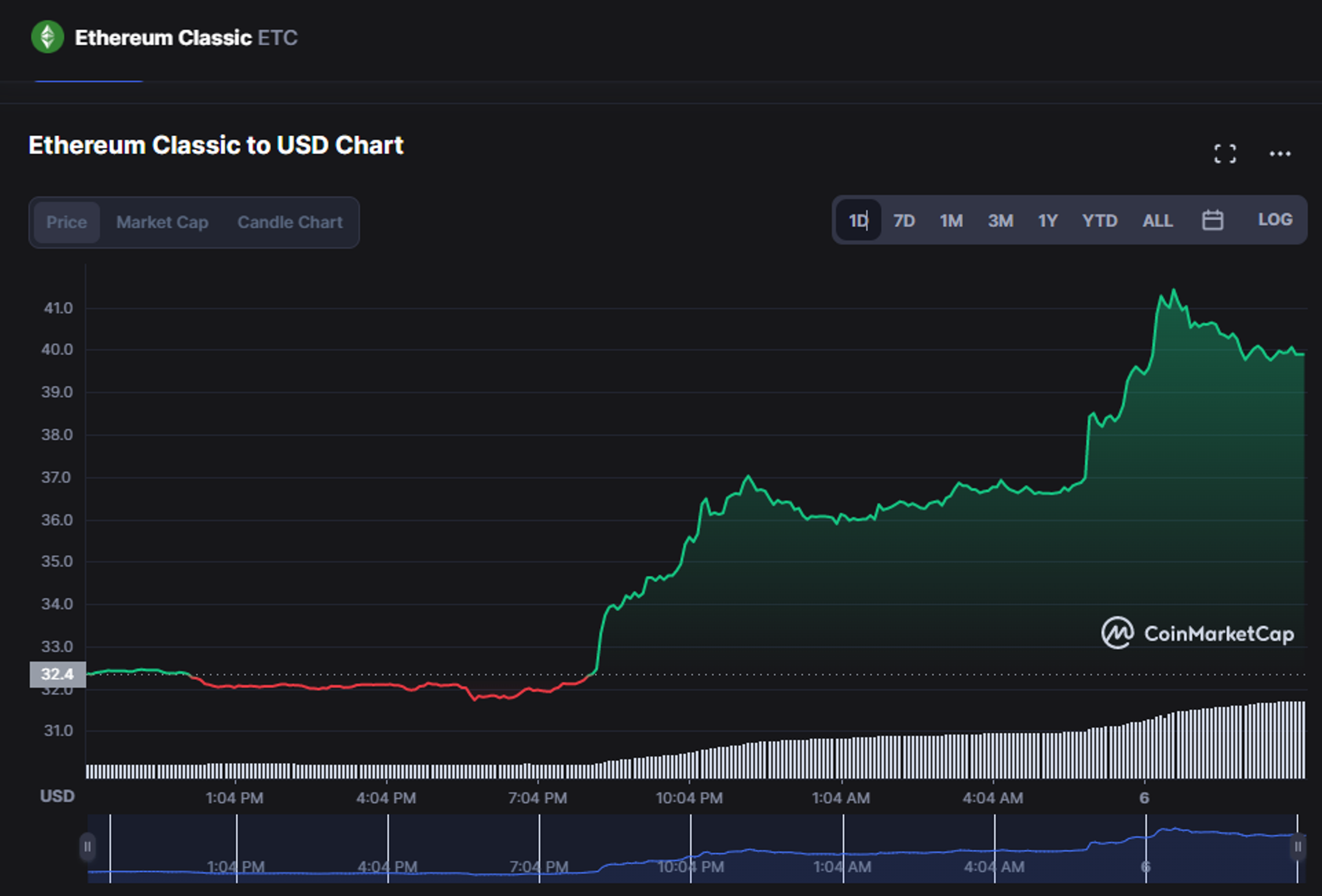 Menurut data CoinMarketCap, harga ETC melonjak 24,4% dalam 24 jam terakhir menjadi $40,38. ETC merupakan blockchain asli dari jaringan Ethereum (ETH) yang di-forking pada tahun 2016.