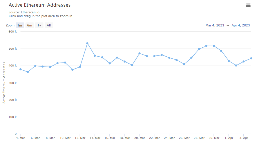 Per 4 April 2023, jumlah alamat wallet aktif harian di jaringan saat ini tercatat mencapai 443.292. Padahal dalam tiga bulan pertama 2023, jumlahnya terus stagnan di bawah 400.000.