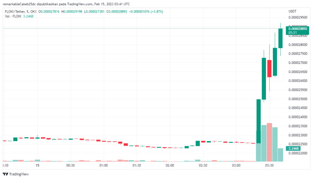 Berdasarkan data TradingView, harga FLOKI pumping dari $0,0000225 ke $0,0000302 hanya dalam beberapa menit. Level kenaikan harga FLOKI ini mencapai 34,22% dari titik sebelum pumping.