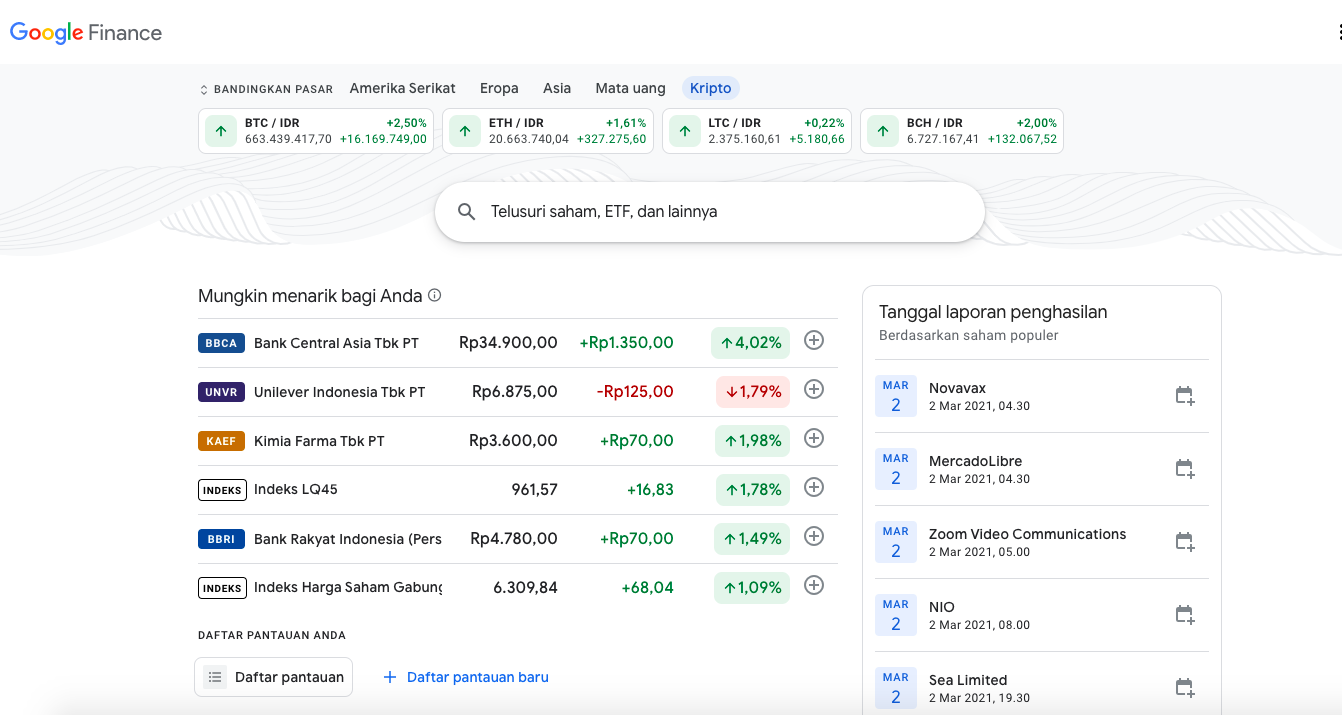 Kolom kripto di Google Finance ini menampilkan informasi dari lima mata uang kripto, yakni Bitcoin (BTC), Ether (ETH), Litecoin (LTC), dan BItcoin Cash (BCH).