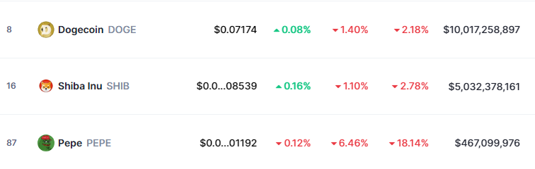 Dua koin meme terbesar berdasarkan kapitalisasi pasarnya, Dogecoin (DOGE) dan Shiba Inu (SHIB), mencatatkan kinerja yang lebih baik dibandingkan PEPE dalam sepekan terakhir. Dogecoin dan Shiba Inu masing-masing hanya mengalami penurunan 2% dalam tujuh hari.