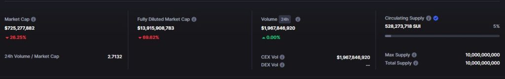 SUI saat ini ada di ranking 64 CoinMarketCap dengan kapitalisasi pasar $727 juta. Adapun jumlah token SUI yang beredar baru mencapai 528 juta SUI atau sekitar 5% dari total suplai. Sedangkan maksimal total suplai SUI mencapai 10 miliar token.