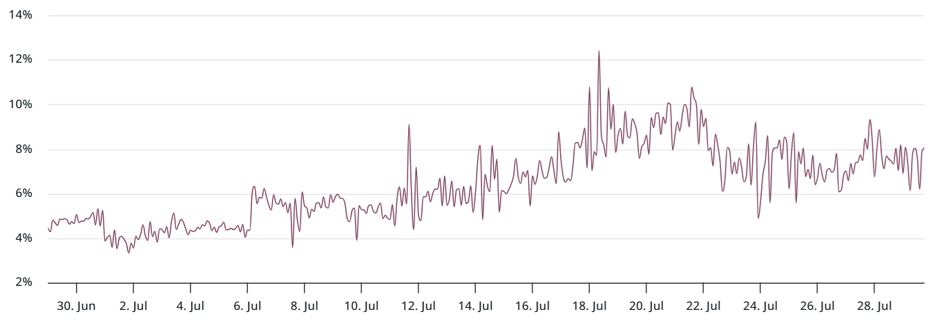 - Sentimen Pasar Netral: Premi futures 3 bulan tetap di kisaran 6–8%, menandakan belum ada tekanan bearish besar.