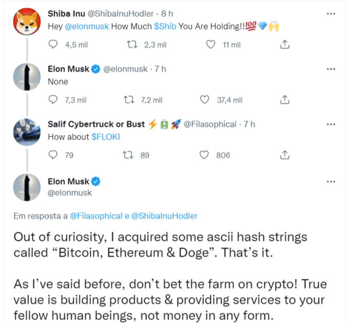 Banyak pihak yang menilai gagalnya SHIB untuk terus melanjutkan bullrun karena cuitan Elon Musk. Elon menjawab sebuah utas dari Holde Shiba yang menanyakan berapa banyak SHIB yang dimiliki oleh bos Tesla tersebut.Â