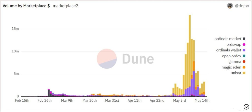 Berdasarkan data Dune Analytics, volume perdagangan token BRC-20 turun setelah mencapai puncaknya pada 7 Mei 2023–meski ada kenaikan kecil dalam dua hari terakhir. Unisat dan Ordinals Wallet masih menjadi penyumbang utama market share di mana masing-masing mencatatkan 67% dan 17% volume dalam 24 jam terakhir.
