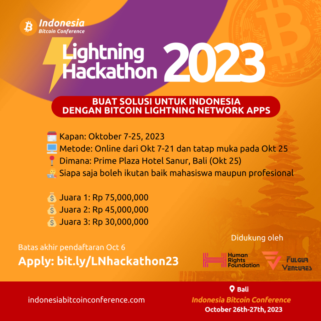 Lightning Hackathon ditutup tanggal 6 Oktober 2023 dan akan diselenggaran secara online, namun untuk presentasi dan demo dari aplikasi akan diselenggarakan pada tanggal 25 Oktober di Bali sebagai rangkaian dari Indonesia Bitcoin Conference.
