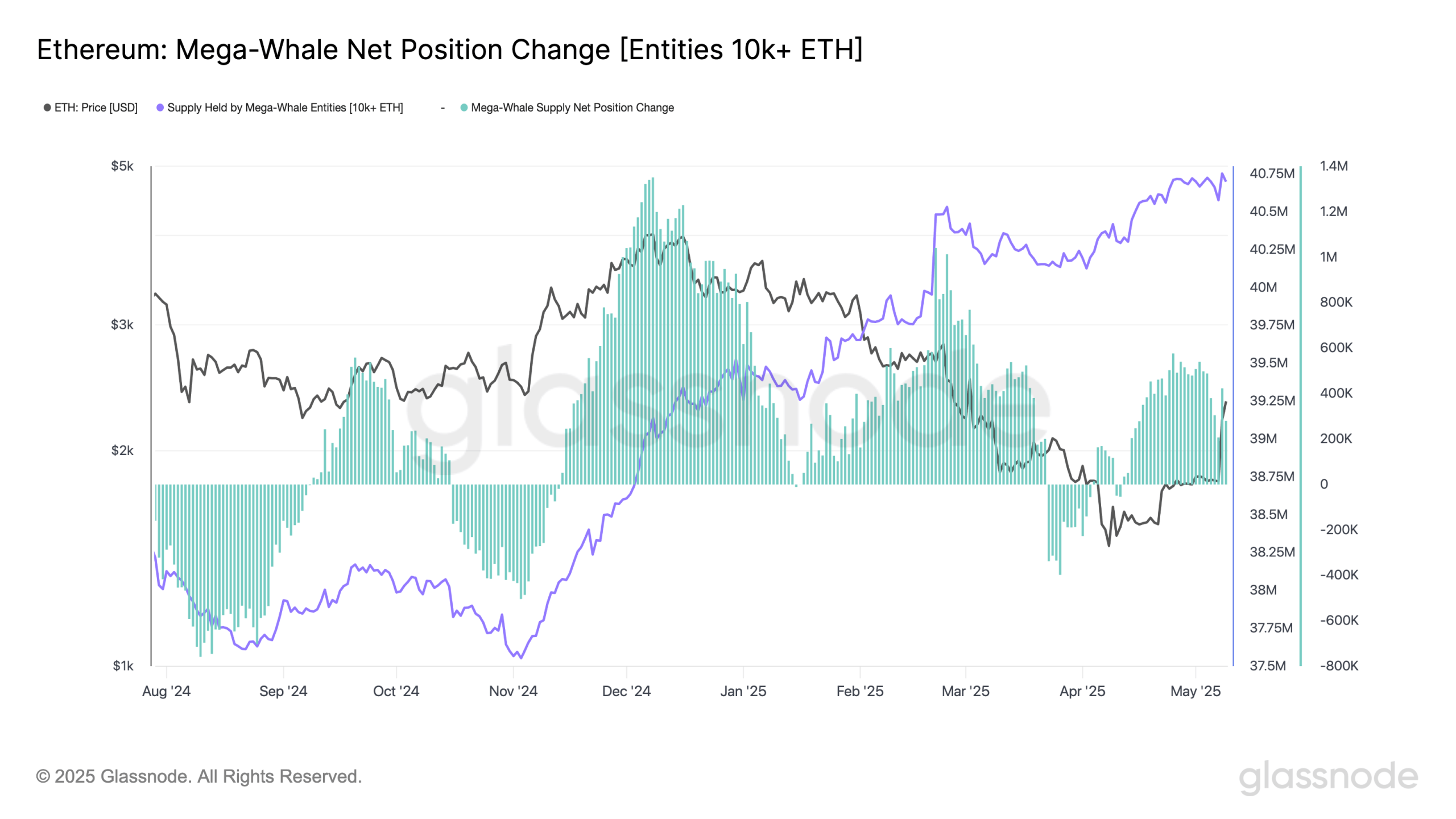 Menurut data dari Glassnode, akumulasi bersih whale mulai positif sejak akhir April, dan total ETH yang dipegang whale kini mencapai lebih dari 40,75 juta ETH, tertinggi sejak Maret 2025.