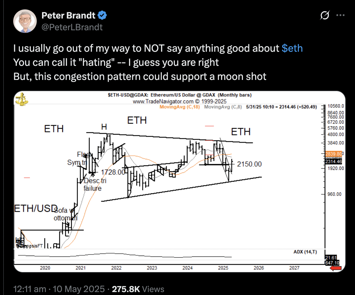 Analis senior seperti Peter Brandt juga memperkirakan potensi Ethereum untuk mencetak kenaikan besar (“moonshot”) dalam waktu dekat jika tren ini berlanjut.