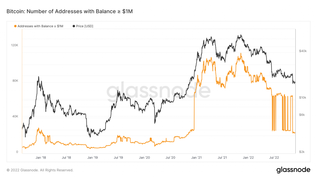 Lebih jauh, data Glassnode juga menunjukkan bahwa para ‘jutawan Bitcoin’ dengan saldo Bitcoin setara $1 juta atau lebih telah mengalami penyusutan tajam selama setahun terakhir.