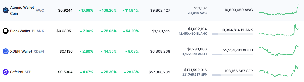 Menurut data CoinMarketCap, dalam 24 jam terakhir, Atomic Wallet Coin (AWC) naik lebih dari 100%, BlockWallet (BLANK) naik 74%, XDEFI Wallet (XDEFI) naik 44%, dan SafePal (SFP) naik 25%.