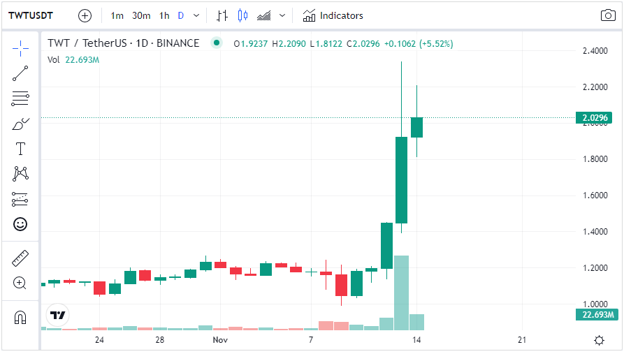 Sejak direkomendasi CZ, Trust Wallet Token (TWT) telah melonjak hingga 74% ke harga $2,06. Token ini memungkinkan pemegangnya untuk berpartisipasi dalam pembuatan keputusan terkait fitur dan update aplikasi Trust Wallet.