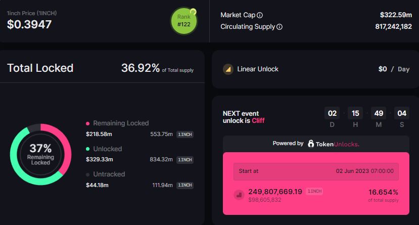 Pelepasan 1INCH akan dilakukan pada 2 Juni 2023. Jumlah token yang diunlock mencapai hampir 250 juta 1INCH atau 16,65% dari total suplai. Total nilai mencapai $98,6 juta.