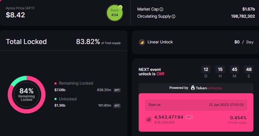 APT akan memulai unlock pada 12 Juni. Jumlah APT yang akan diunlock mencapai 4,5 juta token senilai $38,3 juta. Total APT yang diunlock mewakili 0,45% dari total suplai.