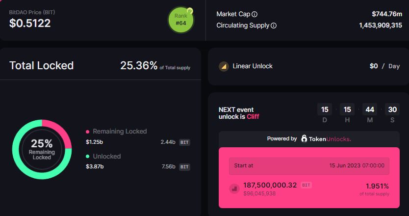 Sehari berselang atau pada 15 Juni, giliran BIT yang melakukan pelepasan token. Jumlah BIT yang dilepas mencapai 187,5 juta senilai $96 juta. Pelepasan BIT tersebut mencapai 1,95% dari total suplai.