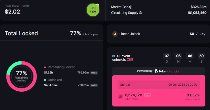 Pada 6 Juni, giliran DYDX yang melakukan token unlock. Jumlah token yang akan dilepas mencapai 0,65% atau 6,5 juta DYDX. Nilai DYDX yang diunlock mencapai $13,2 juta berdasarkan harga terkini.