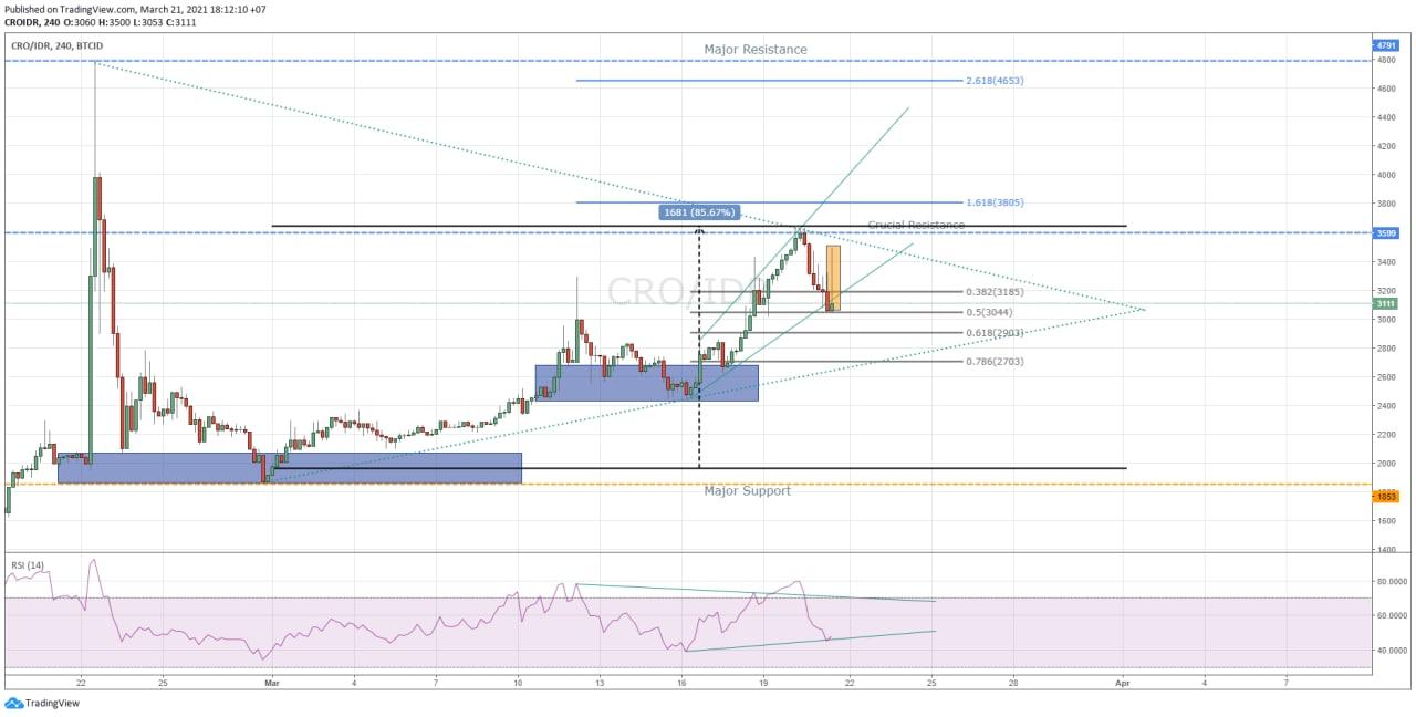 Pada tanggal 1 Maret-21 Maret 2021 harga CRO mengalami kenaikan sebesar 85.67%. Crucial resistance pada saat ini berada pada harga Rp 3,599.