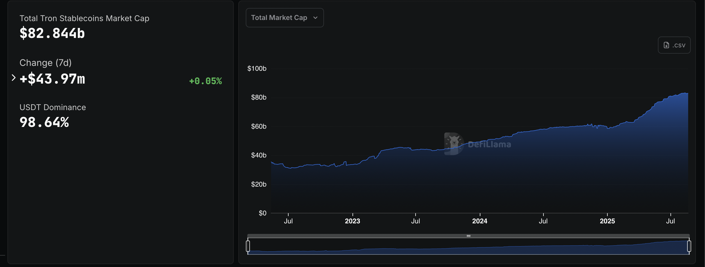 Menurut data DefiLlama, Tron kini tercatat sebagai salah satu jaringan terbesar untuk stablecoin, dengan total lebih dari $82,8 miliar, sebagian besar berupa USDT. Angka ini hanya kalah dari Ethereum yang menguasai sekitar $143 miliar stablecoin.