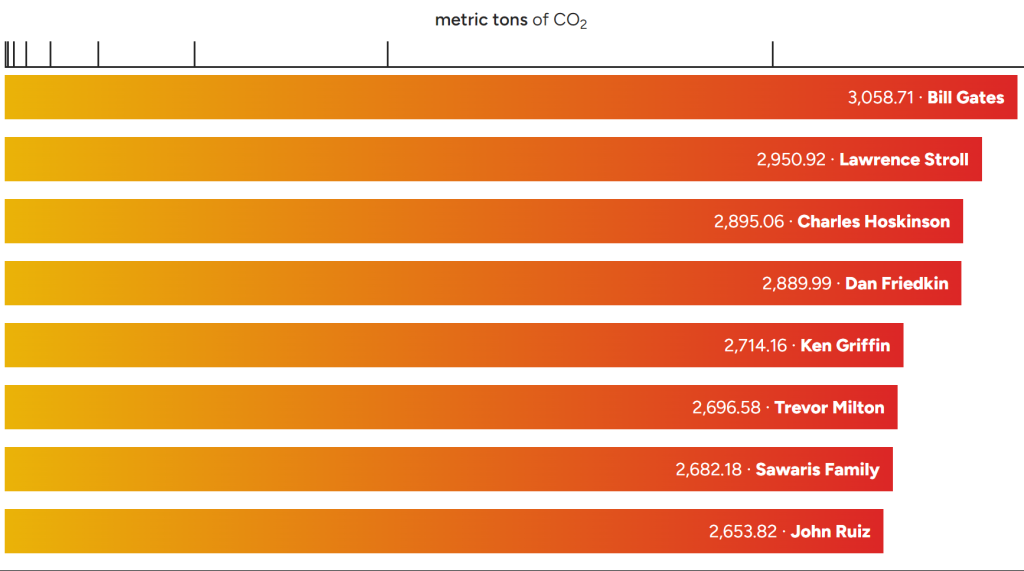 Ratusan kali penerbangan pesawat ini menghasilkan 2.895,06 metrik ton karbon dioksida. Angka tersebut setara dengan sumbangan emisi tahunan rata-rata 186 orang AS. Sumbangan polusi ini lebih besar ketimbang yang dicatatkan pesohor lain macam Mark Zuckerberg, Elon Musk, Jeff Bezos, Mark Cuban, Kim Kardashian, Jay-Z, Steven Spielberg, dan Floyd Mayweather.