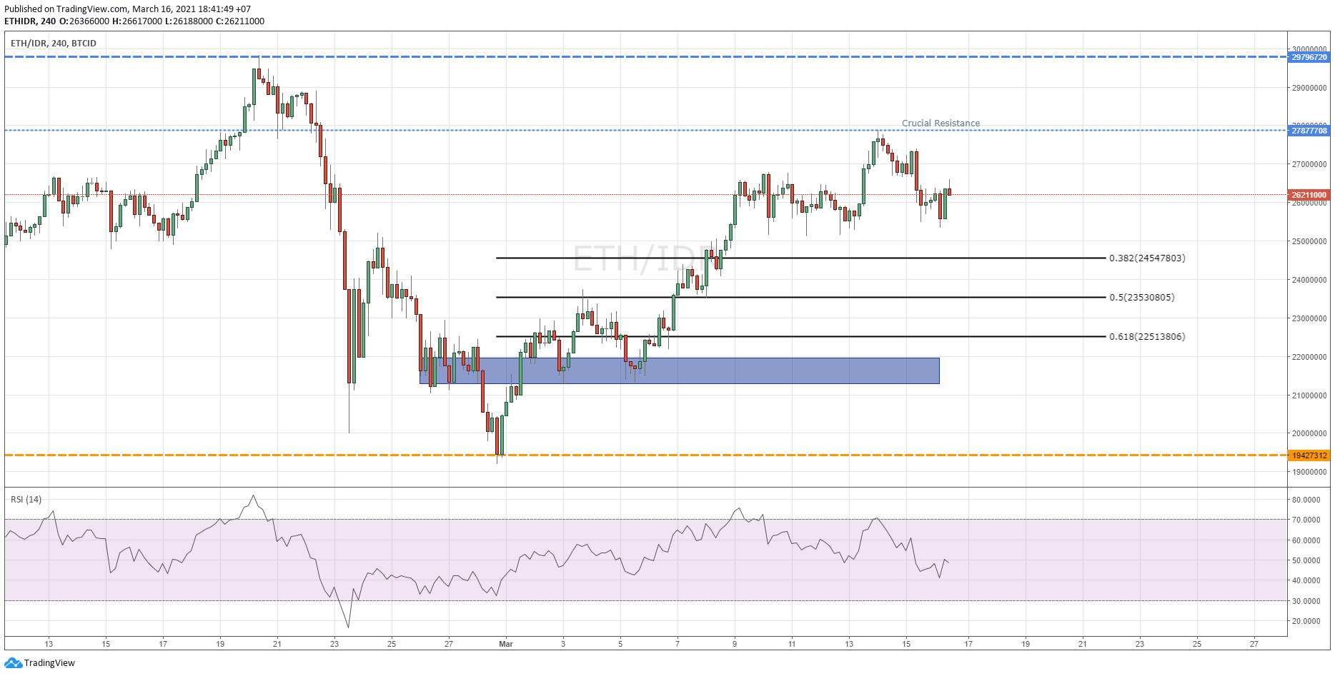 Crucial resistance Ethereum (ETH) berada pada Rp 27,877,708. Pergerakan harga Ethereum (ETH) harus mampu menembus crucial resistance nya agar dapat bergerak lebih tinggi dan mengejar major resistance nya sebelum pada akhirnya dapat menciptakan harga all time high (ATH) yang baru.