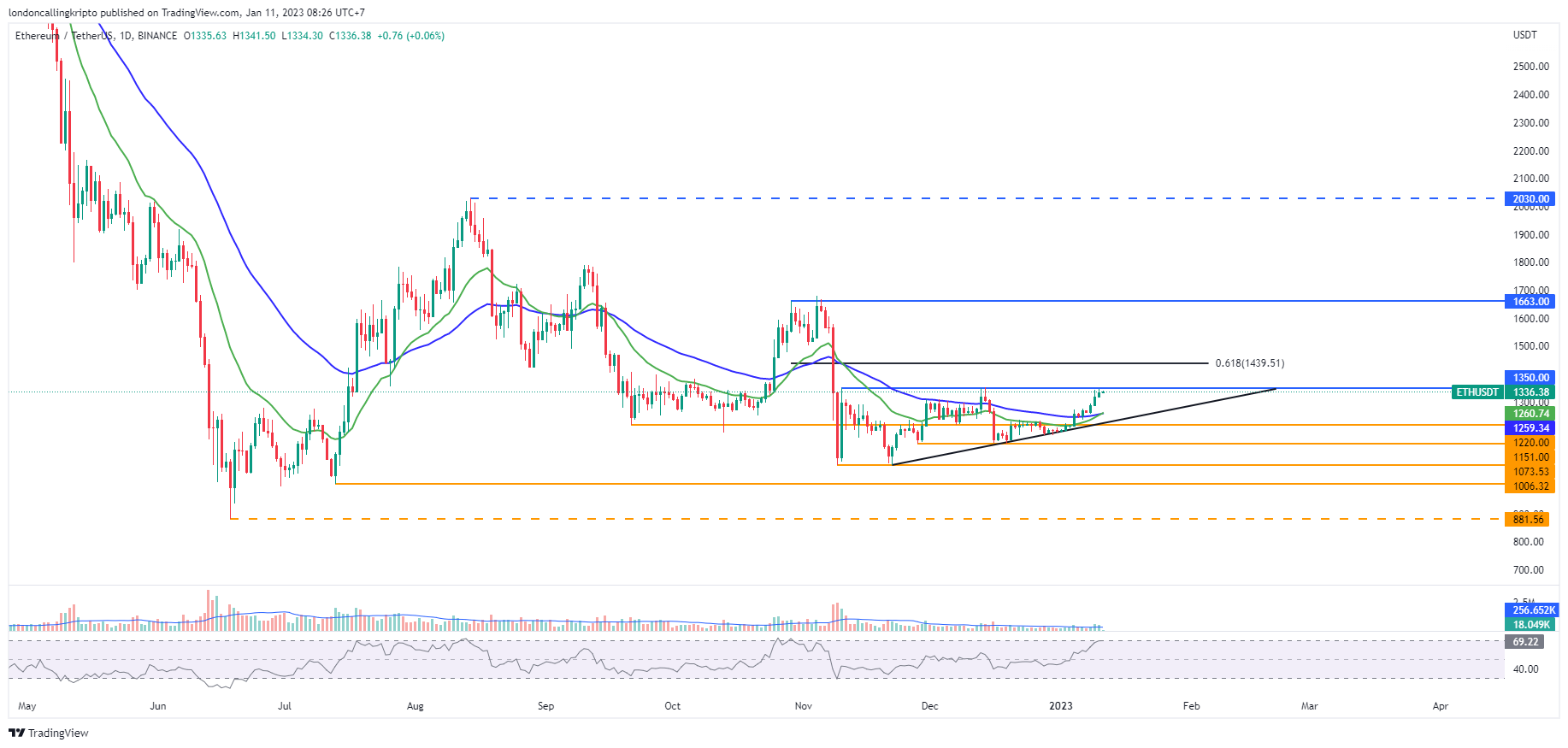 Dinamis support pada 50-day EMA di level $1.259 menjadi tahanan terdekat apabila pergerakan harga ETH koreksi.