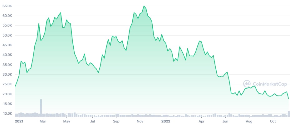 Data terkini CoinMarketCap, Bitcoin, kripto terbesar berdasarkan kapitalisasi pasar, turun 11,65% dalam 24 jam terakhir dan kini berada di level $17.400 yang jadi titik terendah dalam hampir dua tahun terakhir.