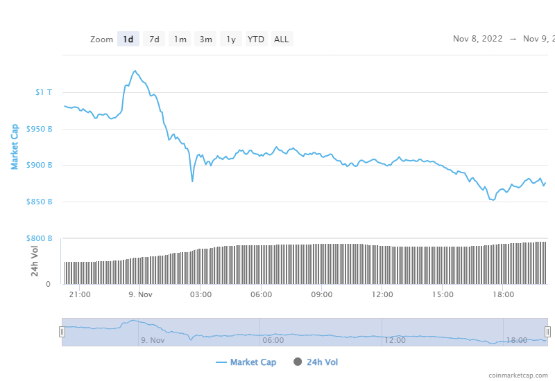 Portalripto.com — Kapitalisasi pasar kripto longsor parah selama 24 jam terakhir pada 8-9 November 2022. Tercatat, total market cap kripto kehilangan hampir dua kuadriliun dalam sehari.