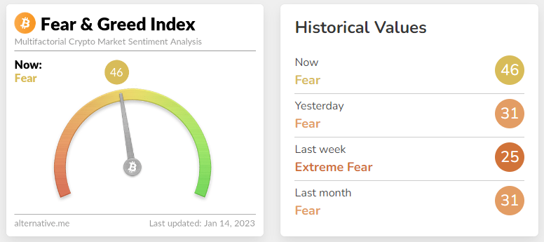 Kenaikan harga pagi ini berhasil mendorong kepercayaan diri pelaku pasar kripto. Sentimen pasar kripto kembali terangkat, hal tersebut terlihat dari kenaikan fear and greed index yang berhasil menyentuh level 46,naik 15 poin dari hari sebelumnya, 13 Januari 2023.