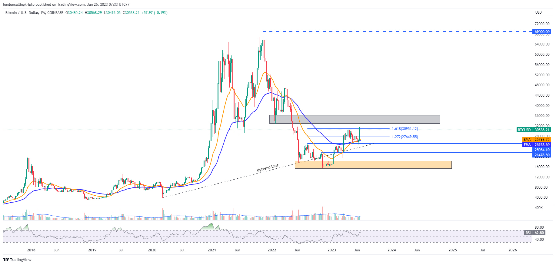 Weekly candle BTC pagi ini ditutup pada harga $30.480, dengan level tertinggi berada pada harga $31.443, dan level terendah berada pada harga $26.250.