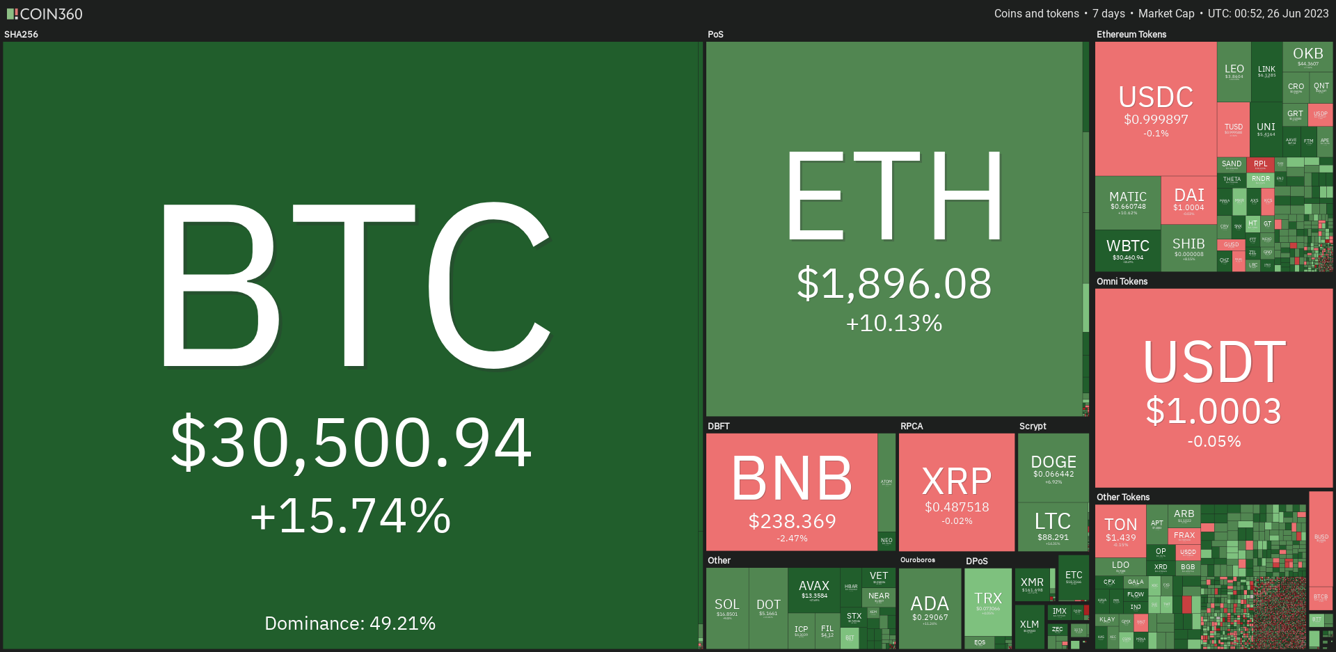 Penutupan kandil mingguan 12 Juni yang membentuk hammer menjadi sinyal terhadap laju bullish Bitcoin saat ini. Kandil mingguan Bitcoin ditutup hijau dengan kenaikan yang signifikan, sebesar 15,73%.