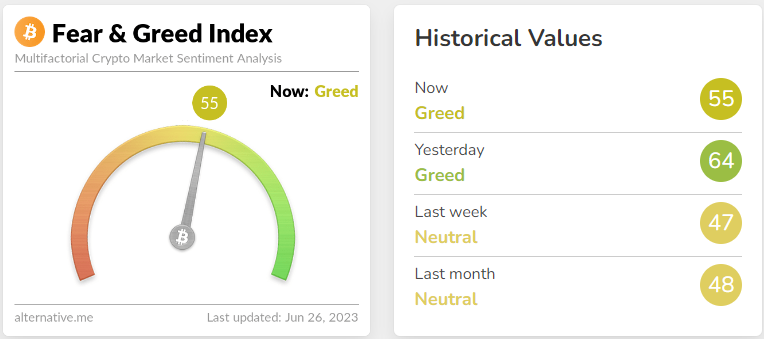 Kondisi bullish yang terjadi pada sebagai besar aset kripto menjadi pemicu yang berhasil menaikkan kepercayaan diri pelaku pasar. Fear and Greed Index berhasil naik dan kembali berada pada kategori Greed.