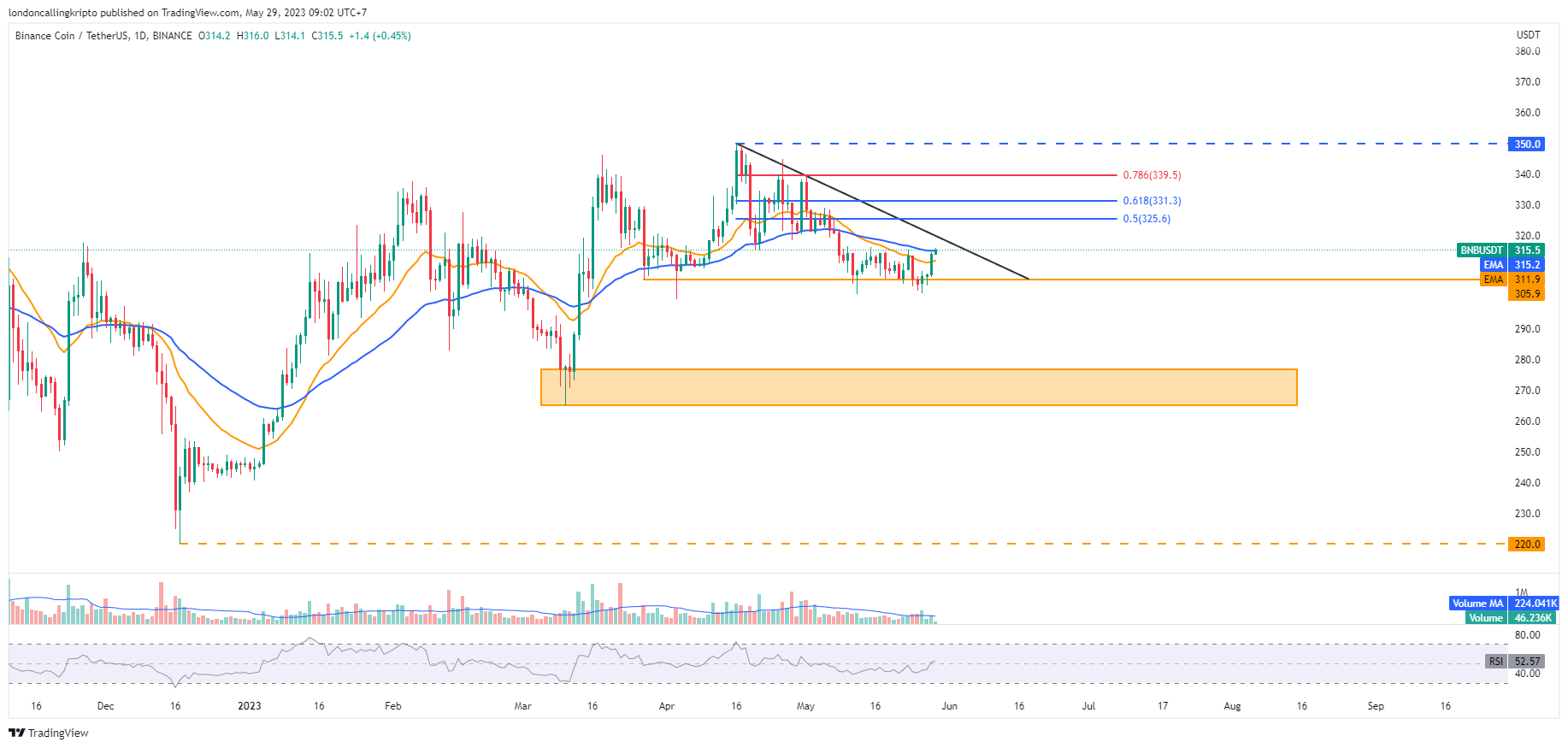 Breakout dinamis resistance pada 50-day EMA akan menjadi pemicu yang baik untuk mendorong kenaikan harga lebih lanjut hingga mampu keluar dari downtrend line. Jika hal itu terjadi, maka laju naik BNB diperkirana akan kembali menyentuh harmonic resistance pada level $325,6-$331,3.