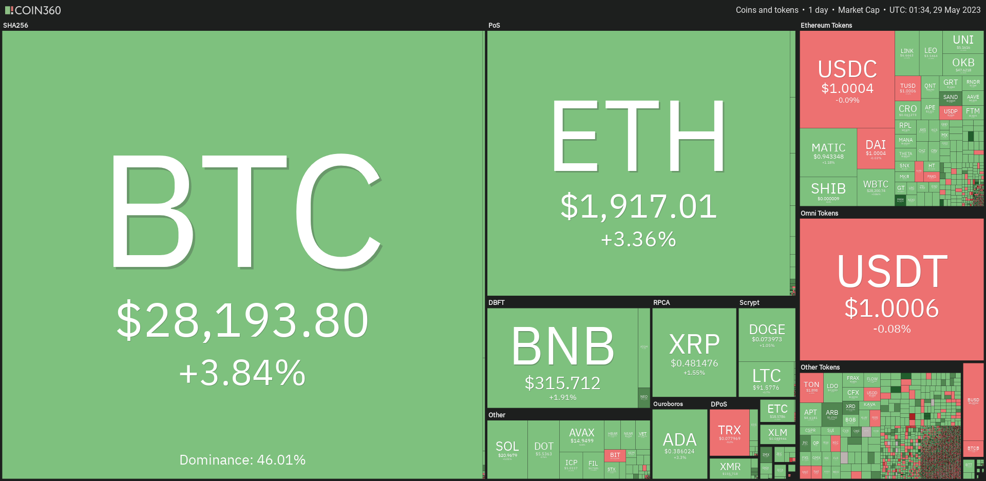 ETH kembali mendapatkan sentimen positif pelaku pasar setelah berhasil breakout resistance pada 23 Mei dan downtrend line. Kandil harian ETH ditutup hijau dengan kenaikan sebesar 4,30%.