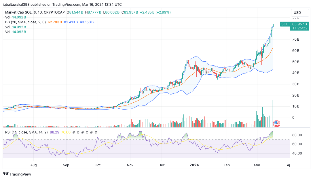 Portalkripto.com- Nilai kapitalisasi pasar Solana (SOL) mencapai rekor tertinggi sepanjang masa pada Jumat malam, Â 15 Maret 2024. Pergerakan data di CoinGecko menunjukkan bahwa token native dari blockchain Solana ini mencapai puncak di atas $82 miliar.