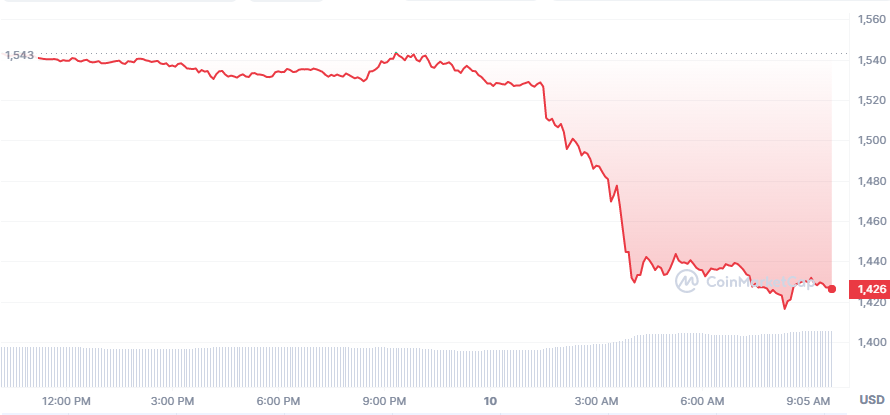 Selain Bitcoin, Ether (ETH) juga mengalami pola bearish yang sama. Harga ETH jatuh 8% pada dini hari tadi dan kini diperdagangkan di $1.400.
