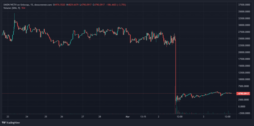 Berdasarkan data DEX Screener, harga XMON mengalami penyusutan tajam hingga lebih dari 97% pada 2 Maret. Harga XMON yang semula ada di kisaran $25.275 turun menjadi $690 sebelum kemudian perlahan sedikit naik ke titik $4.922 per 3 Maret.