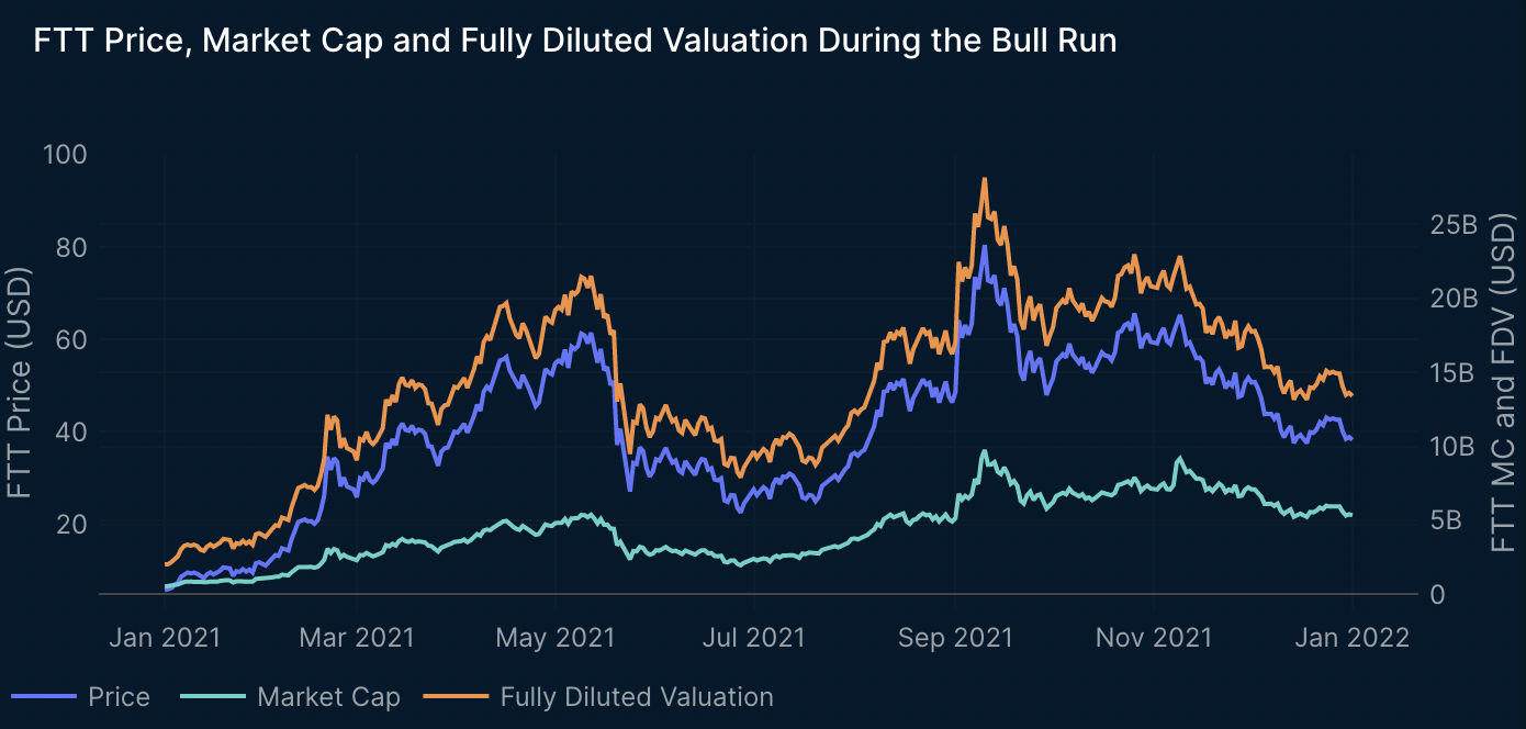 Menurut penjelasan Nansen, naiknya nilai FTT pada bull market 2021 ikut menaikkan nilai di neraca keuangan Alameda. Saat itu token FTT naik 800 kali lipat dari $0,10 menjadi $84.