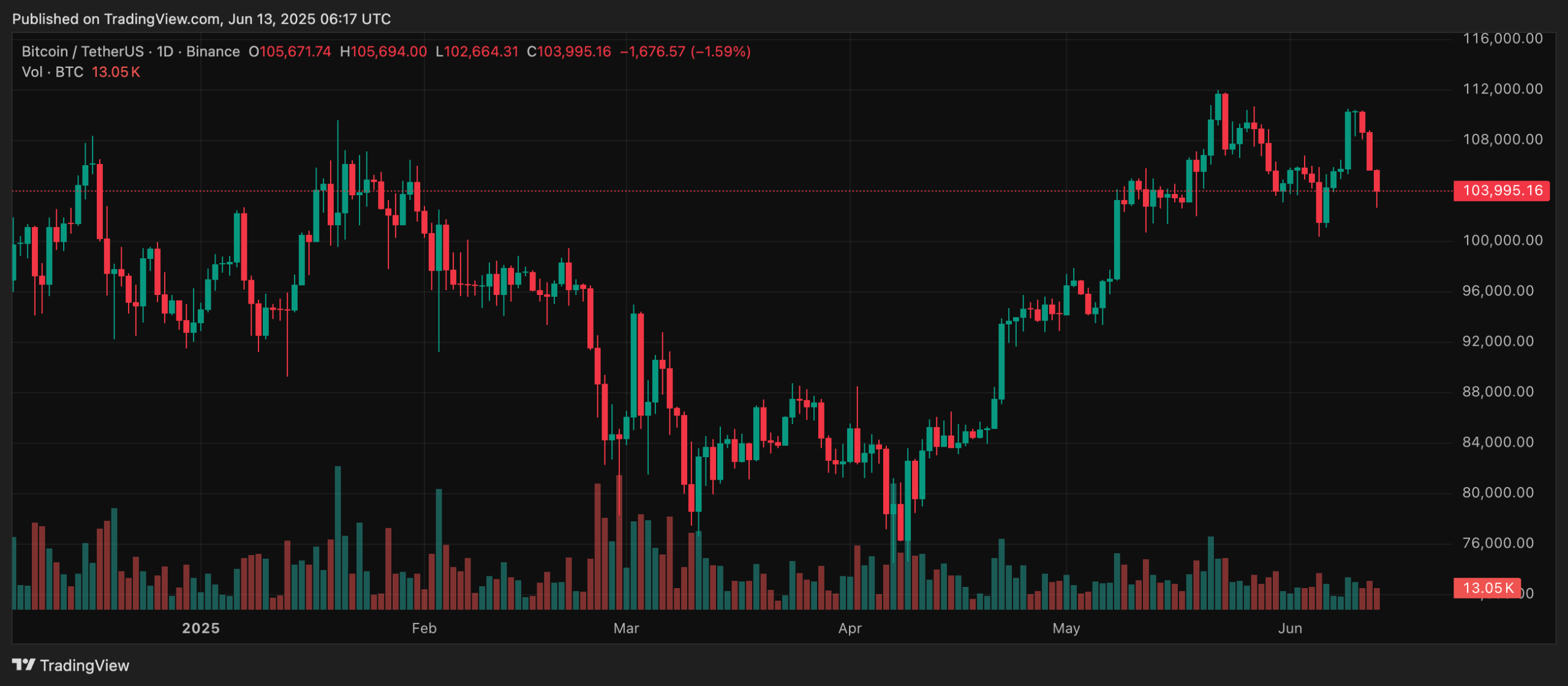 BTC sempat menyentuh level tertinggi mingguan di $110.653 pada Senin, 9 Juni 2025, namun kini turun ke level terendah $102.664 pada Jumat, 13 Juni 2025.