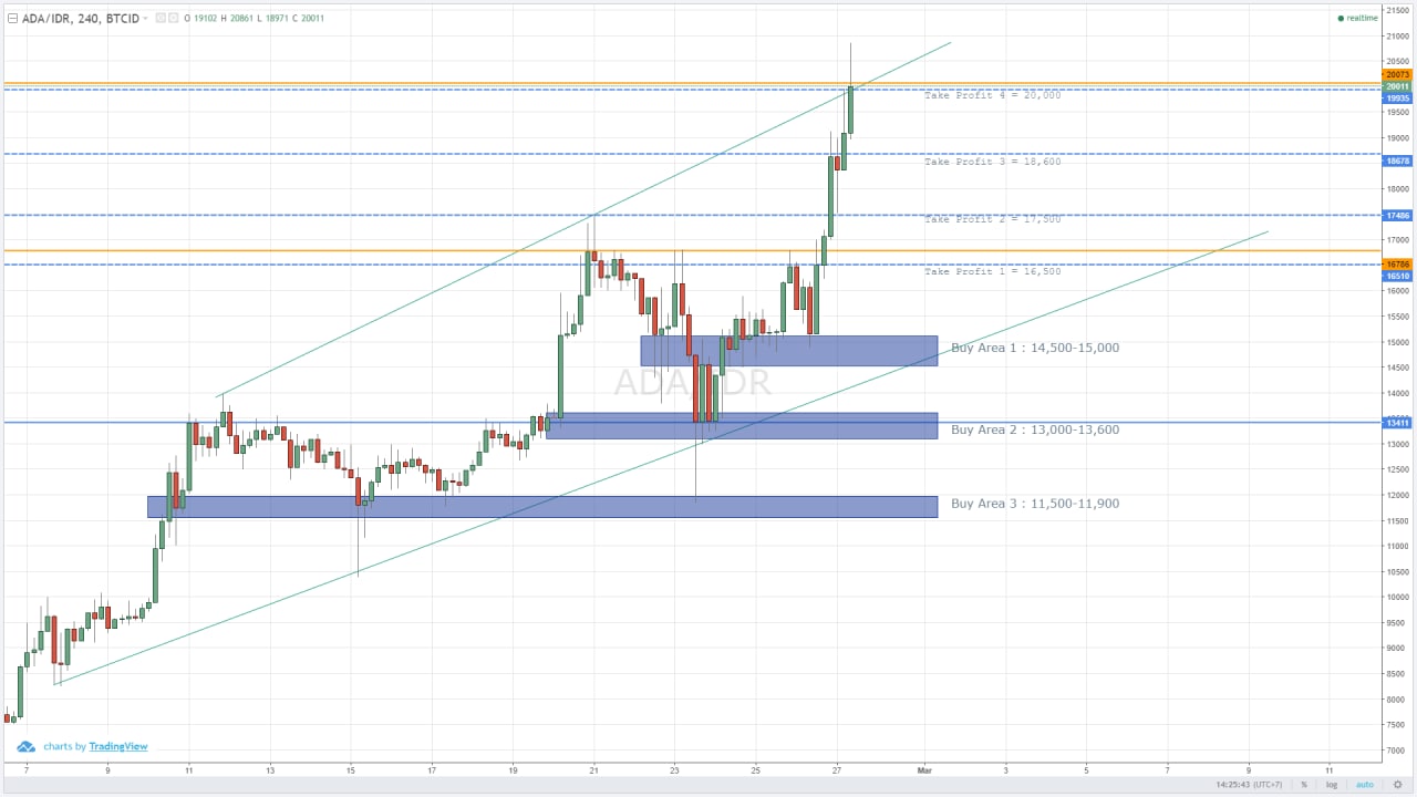 Tersisa sehari lagi (H-1) sebelum Mary hard fork nya Cardano (ADA) ya guys, saya pribadi sih sudah jual Cardano (ADA) pada saat harga pumping kemarin, bagi kalian yang ingin membeli atau buyback Cardano (ADA) sekarang, tetap selalu bijak untuk melakukan buy nya ya , tentukan dulu Buy Area nya dengan menggunakan Teknikal Analisis, walau fundamental Analisis Cardano (ADA) sedang bagus karena ada Major Update.