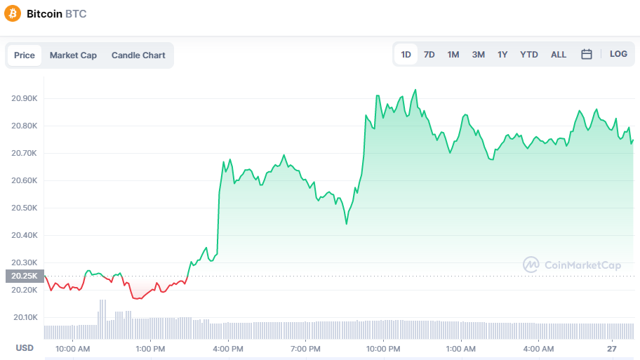 Menurut CoinMarketCap, pada Rabu malam, Bitcoin menguat ke $20,932. Kini BTC diperdagangkan sedikit lebih rendah di $20.760.