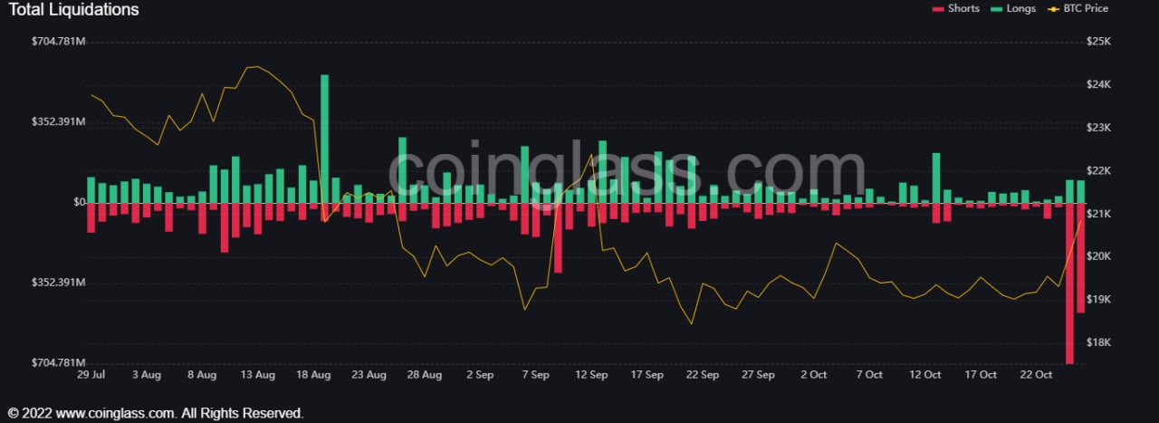Sebagai respons dari pergerakan harga ini, terjadi likuidasi besar-besaran hingga $1,13 miliar atau sekitar Rp17,6 triliun di seluruh pasar kripto dalam 24 jam terakhir.