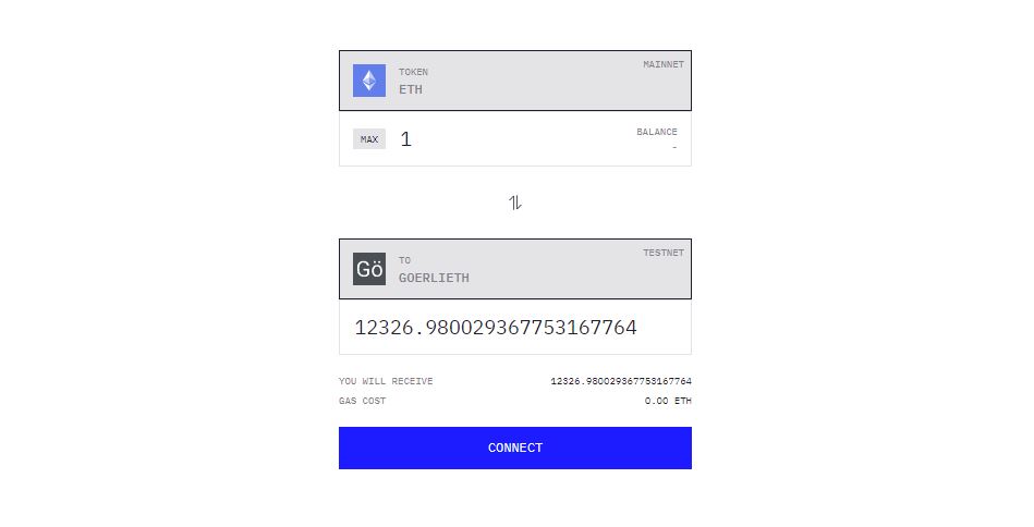 LayerZero menetapkan harga Goerli ETH $0,10 per keping. Namun data terkini di Testnet Bridge menunjukkan 1 ETH hanya dapat ditukar dengan 12326.98 Goerli ETH atau $0,137 per keping.