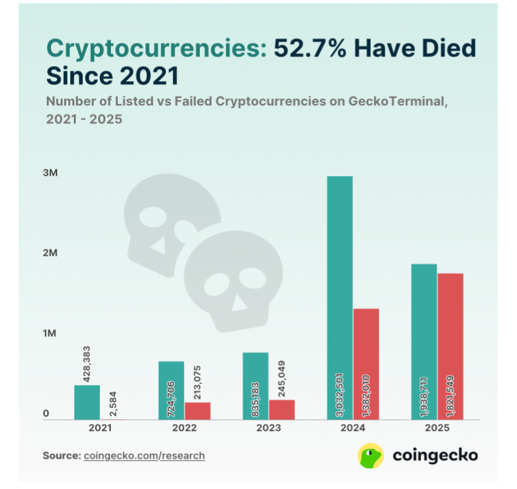 Portalkripto.com — Industri kripto dibanjiri proyek baru, namun tak banyak yang mampu bertahan. Menurut laporan CoinGecko, sekitar 52,7% dari semua proyek token yang tercatat di GeckoTerminal telah gagal, dengan sebagian besar kegagalan terjadi selama tahun 2024 dan awal 2025.