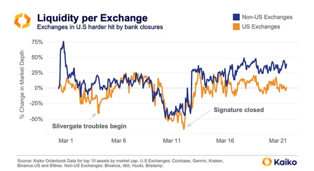 Menurut Kaiko, exchange yang berbasis di AS lebih terdampak masalah likuiditas dari pada exchange non-AS seperti Binance. Hal ini diduga karena bank-bank yang mengalami kejatuhan mayoritas berbasis di AS.