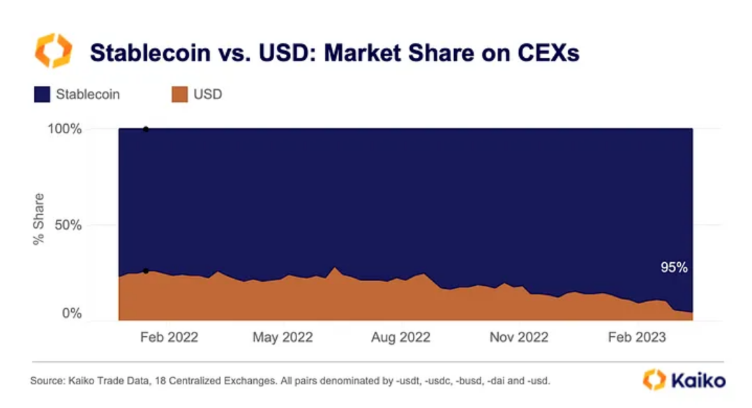 Runtuhnya sejumlah bank tradisional ramah kripto tercatat ikut membuat volume stablecoin di centralized exchange (CEX) meningkat dari 77% menjadi 95%. Artinya, banyak investor yang beralih dari trading pair dolar AS ke trading pair stablecoin.