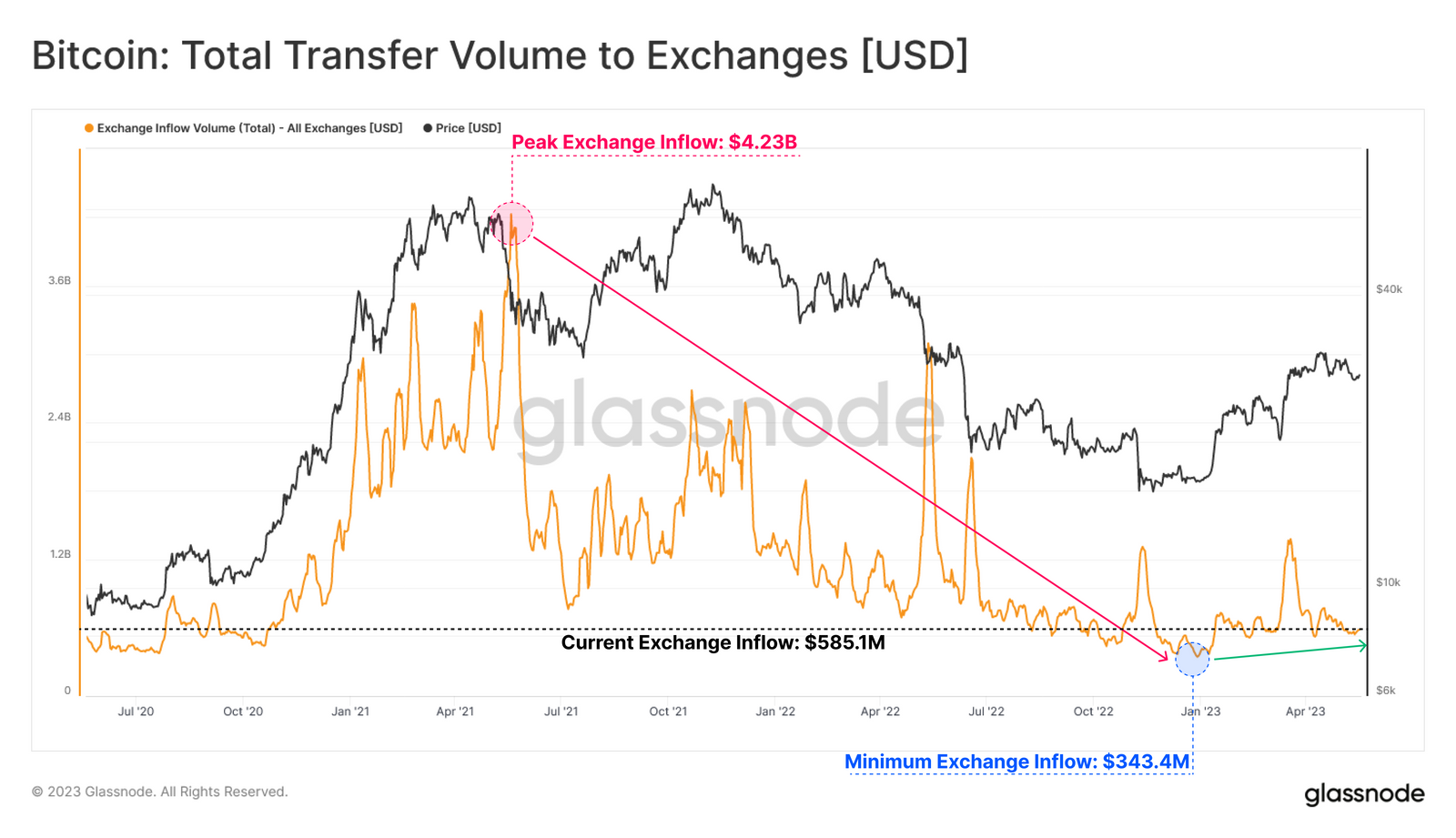 Volume transfer BTC ke exchange juga sama seretnya. Inflow BTC ke exchange saat ini berada di kisaran $585,1 juta, turun dari $4,23 miliar pada Mei 2021.