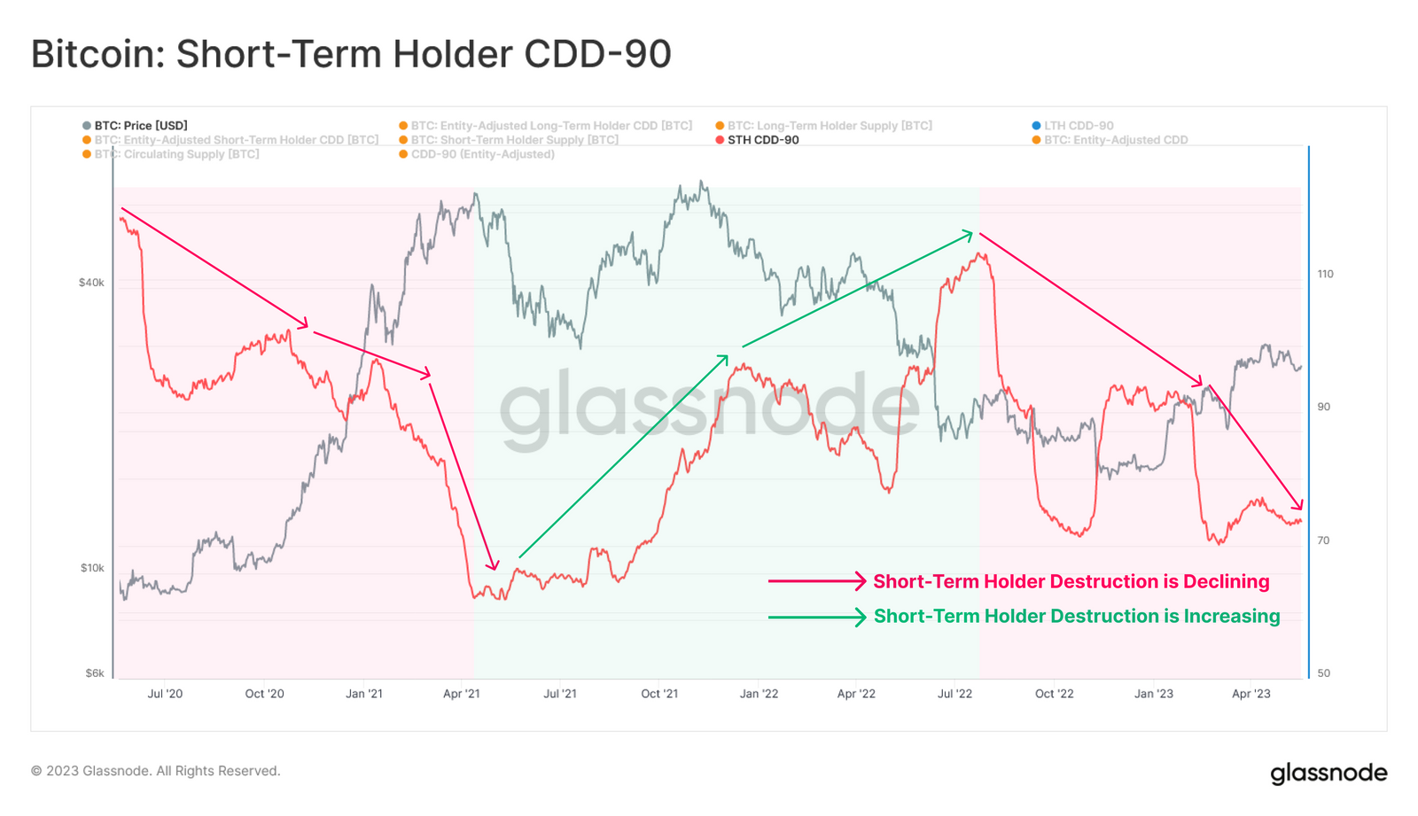 HODL tak hanya dilakukan LTH, investor jangka pendek atau short-term holder (STH) juga dalam periode sideways kali ini masih enggan melakukan aksi jual. Menurut grafik Coinday Destruction-90 (CDD-90), dalam 90 hari terakhir, mayoritas STH masih memilih untuk menyimpan BTC mereka.