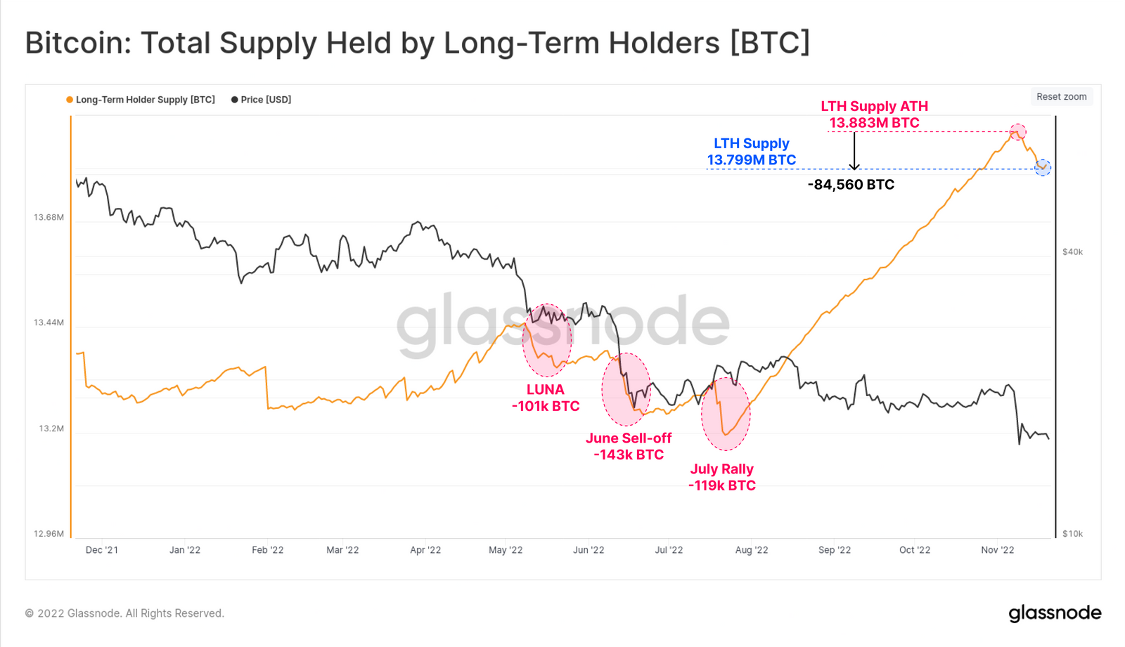 Menurut data terbaru dari platform data on-chain Glassnode, pada awal November 2022, LTH memegang sebanyak 13,883 juta BTC. Jumlah itu berkurang menjadi 13,799 BTC pada saat ini.