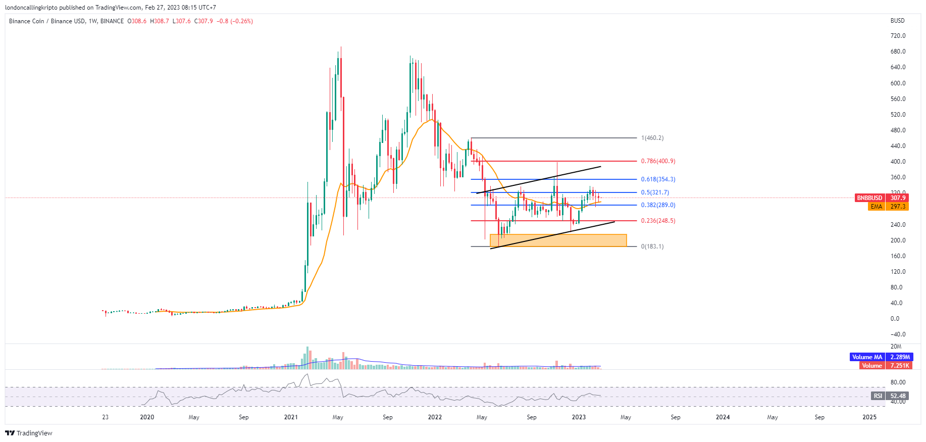 Pergerakan harga BNB cenderung sideways pada area $289-$321. Breakout atau breakdown terhadap area tersebut akan menjadi penentuan arah pergerakan harga BNB kedepannya.
